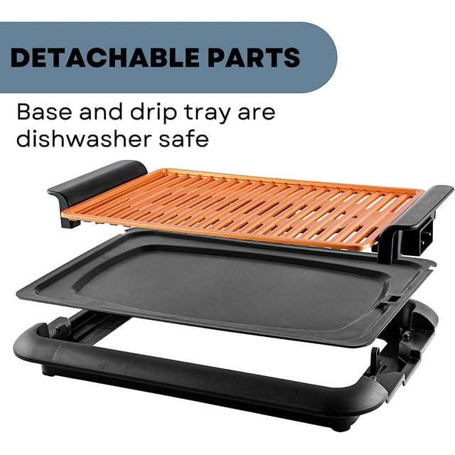 CONVENIENCE AT ITS FINEST – Making mouth-watering meals for your family is easier with OVENTE Indoor Electric Grill. The large 15 x 10-inch non-stick plate allows you to cook multiple foods at once, saving time and energy. Serve sizzling steak, chicken skewers, kabobs, bacon, salmon; the list goes on.HEATS UP QUICKLY & EASY CONTROL – Powered by 1200W with adjustable temperature settings (240℉-400°F) to achieve amazing grill marks. Features a circular heating element that allows it to heat up faster and evenly, so you can cook everything to perfection.HASSLE-FREE INDOOR GRILLING – It produces less smoke so you can enjoy all the fun of an outdoor barbecue in the comfort of your home. The removable drip tray captures fat and oil, while the cool-touch handles provide extra safety to prevent any accidents and nasty burns.DISHWASHER SAFE PARTS – Cleaning won't be an issue because we made sure that all parts of our electric grill are detachable. Simply place the grilling plate and the drip tray into your dishwasher for quick and efficient cleanup.