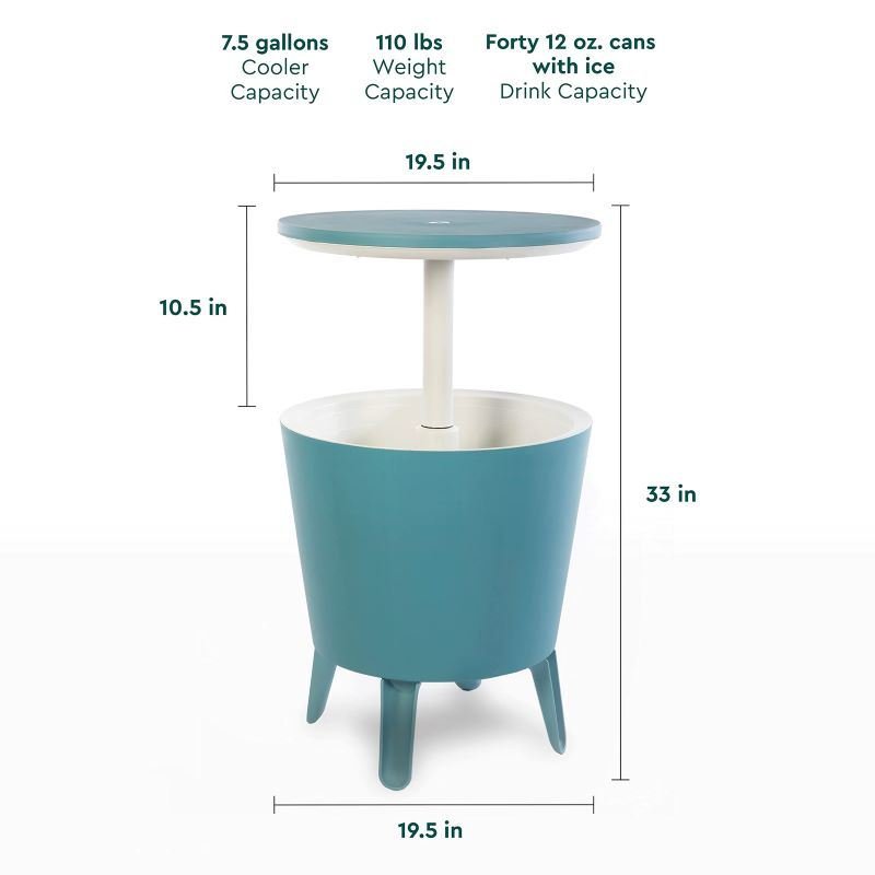 2.Lid elevates upwards 10 inches above the rim for use as a patio bar table. The top reveals a hidden cooler with 7.5-gallon capacity. Keep up to forty 12 oz. cans ice cold.